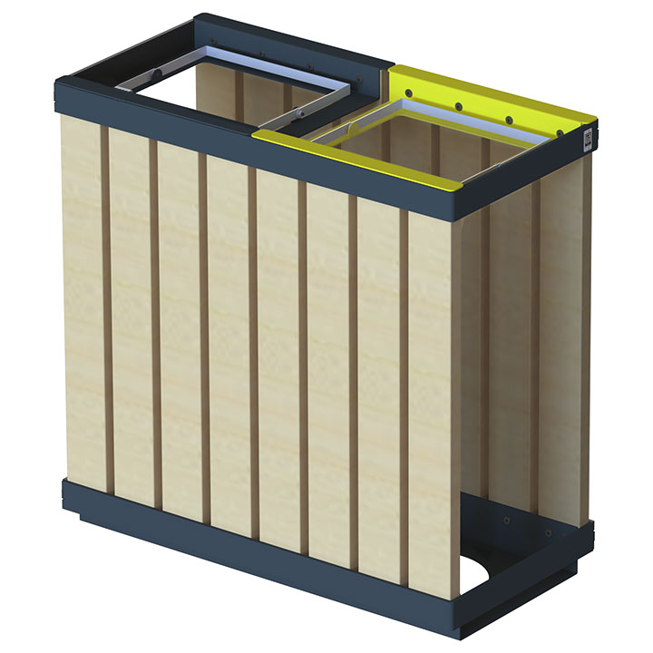 Largeur 960mm, Hauteur 948mm, Profondeur 480mm, Poids 80kg, volume 2x110L, matériaux acier et robinier