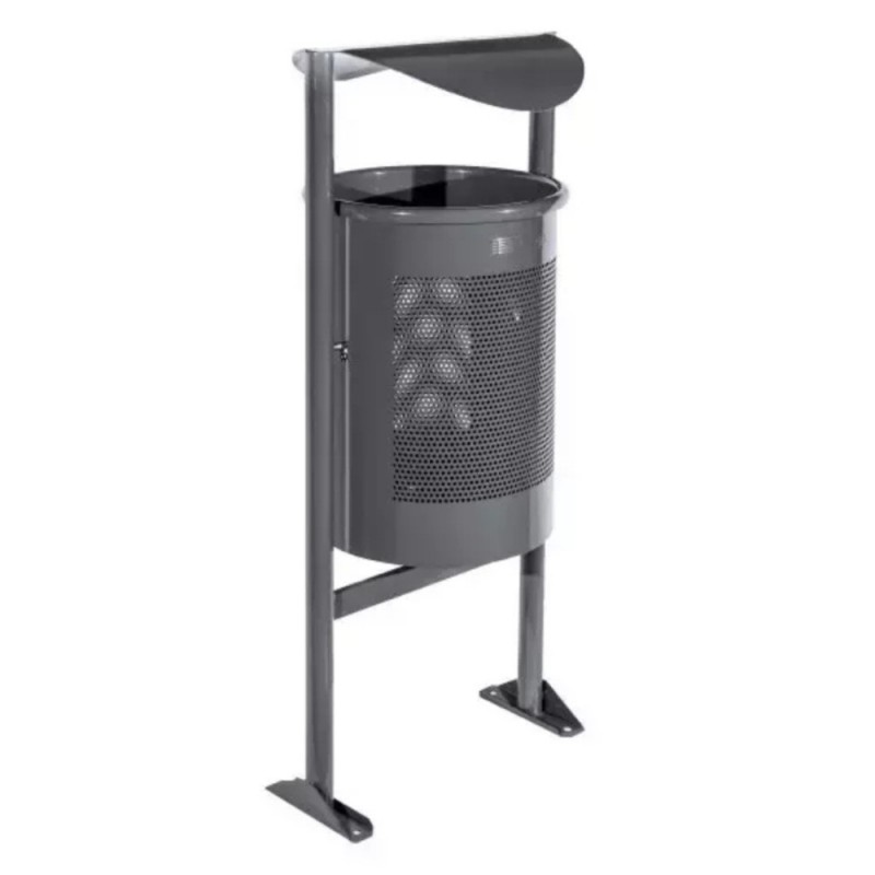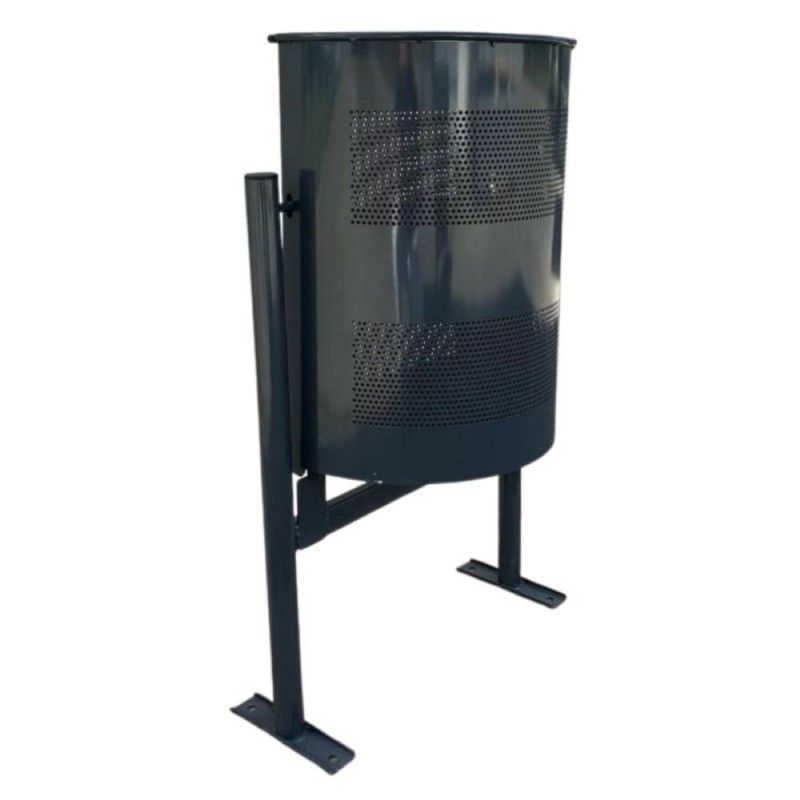 Dimensions : H.88,4 cm x l. 47,5 cm – ⌀38 cm, Capacité : 60 L, Poids : 11 kg, Structure en acier traité anti-corrosion, Finition peinture époxy gris RAL 7011,n seau basculant en tôle perforée